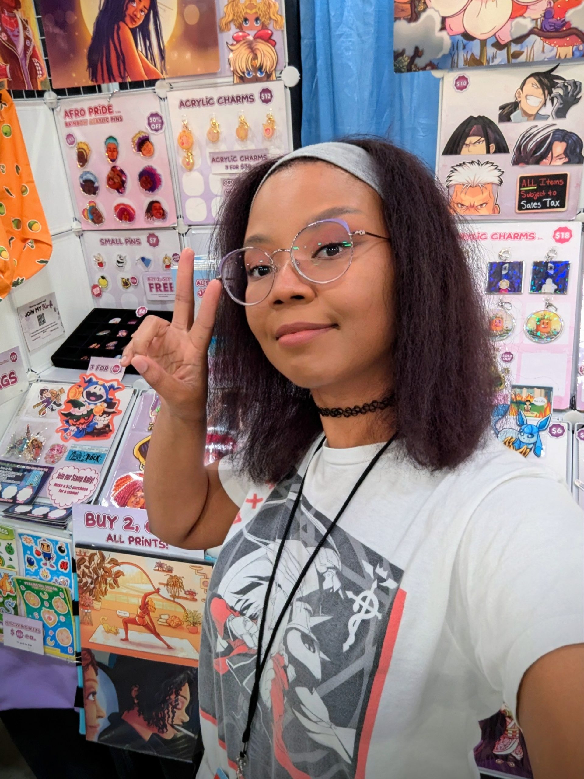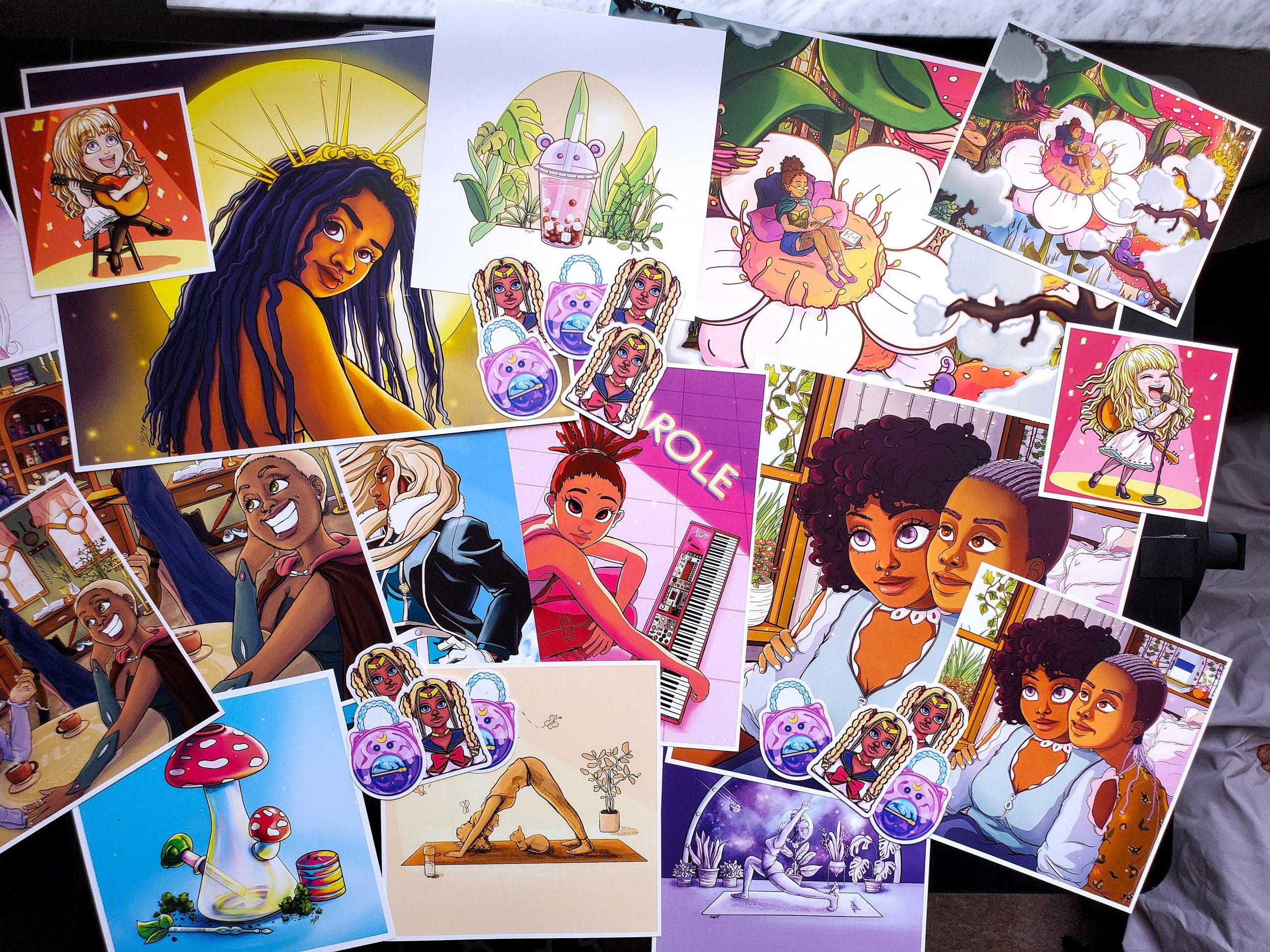 My art shop contains many different custom designed prints, stickers, acrylic charms, pins, totes, coin pouches, temporary tattoos, magnets, puzzles, reusable sticker books, and lanyards. The designs include vibrant original art depicting cozy scenes, fantasy themes. I also love to create fan art from my favorite anime’s and video games. (Fullmetal Alchemist, Tekken, Carole and Tuesday, Pokemon, Bomberman, etc). I list my wares online but i primarily vend at different events to sell my work in person. I frequent anime conventions, gaming tournaments, comic cons, and art markets all over the state. I’m basically a carney.
