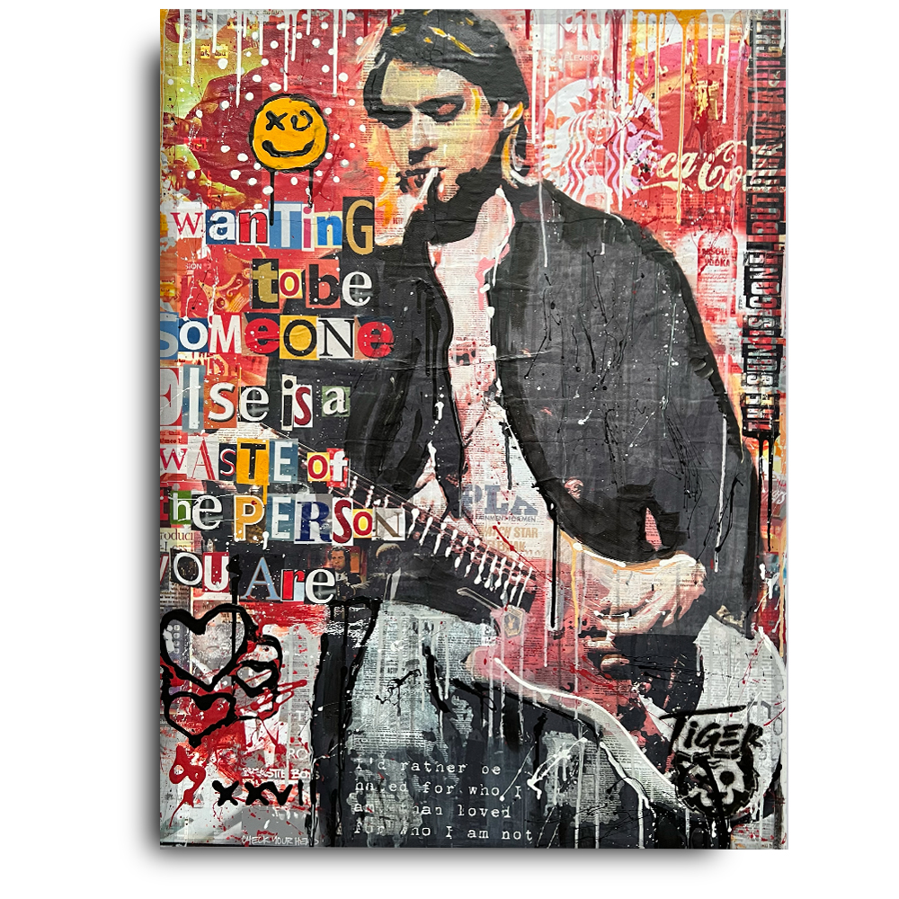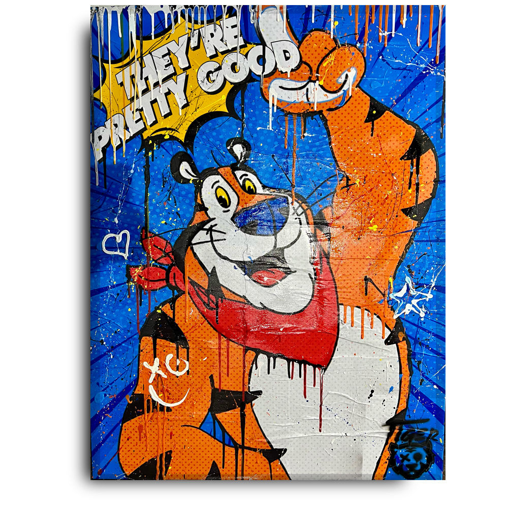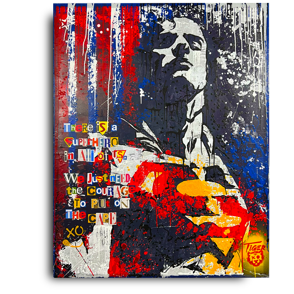 My artistic journey began with oils on canvas in his youth, leading to a career in graphic design and eventually founding his branding agency. Drawing inspiration from pop culture, urban nature, music, comics, and film, Tiger’s style now embodies Pop Grunge Graffiti Street Art – a captivating blend of paint and collage that immerses viewers in rich, detail-laden scenes.