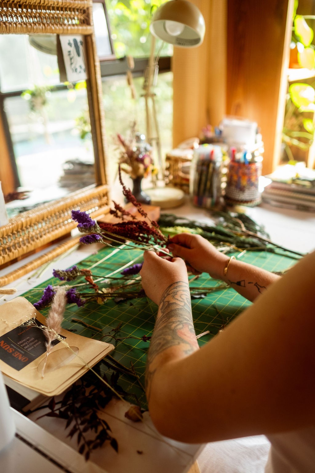 When diving into what type of plant-related business, my background greatly influenced me in herbalism, my love for flowers, and the genuine pleasure of botanically-based luxuries such as skincare and dyed garments. My husband, Philip, and I started brainstorming product ideas and applying for licenses, and I dove in deep into graphic design and website building all by myself. Doing the work of conceptualizing and creating all of our branding and packaging helped boost my confidence. We had ONE SUN pop-up at a local plant market in October of 2022 and have yet to look back. Our product range now includes herbal beverage blends, tinctures, dried florals, botanically dyed garments, skin care products, and live plant starts. I recently left my part-time job to focus on ONE SUN full-time. We now host workshops and are popping up 8-10 times a month in the greater Orlando area, and we have a mobile dried-flower bar available for private events. We have been continuously blown away by the amount of support we have received in the last year and a half, and we can not wait to see what the future holds for ONE SUN.