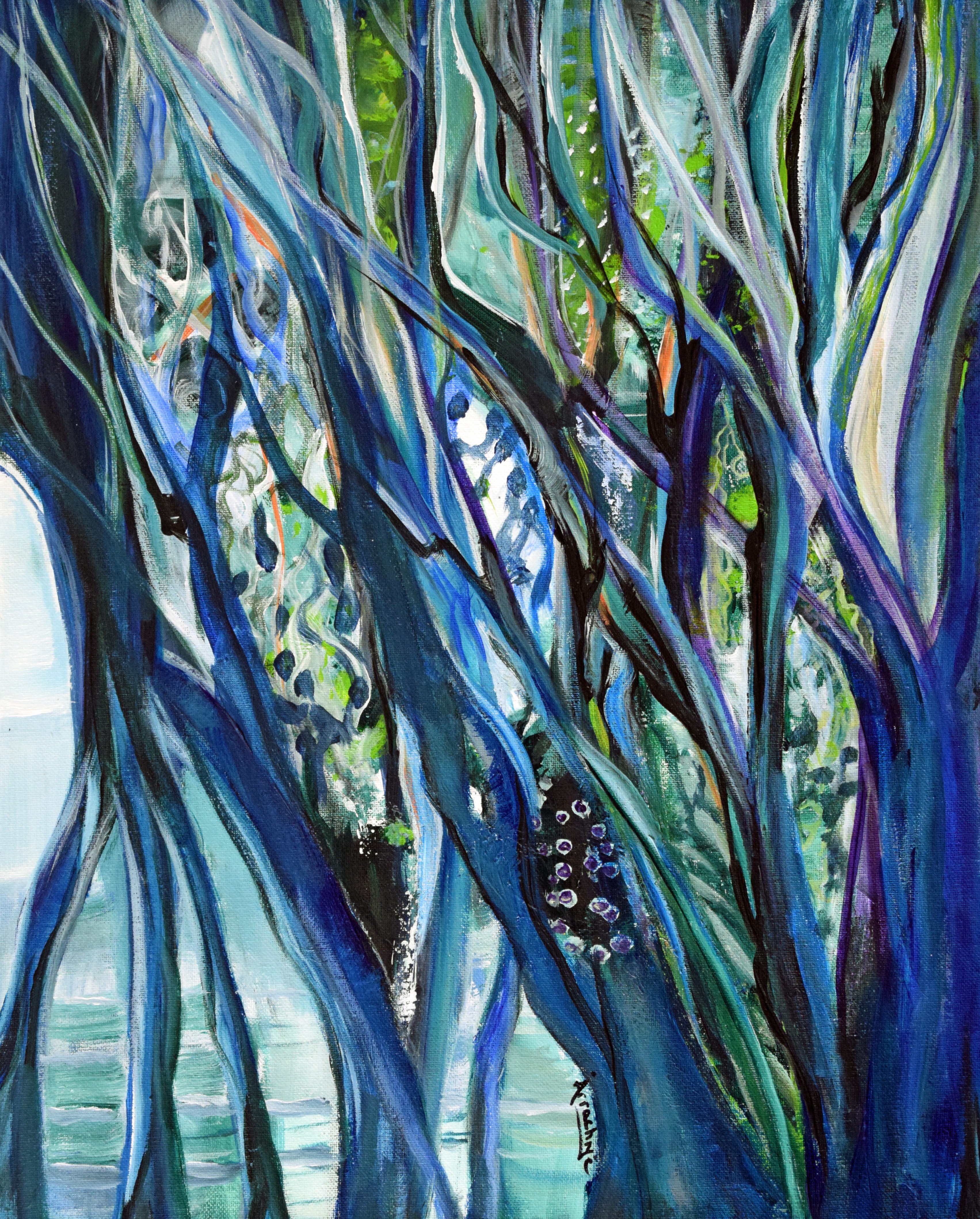 The early playful marks evolve organically into forms full of rhythm and emotion. The vegetation in her Watergarden paintings, for instance, appears to rise upward from the waterline toward the clouds, drawn by an invisible current of life. Beneath the surface, roots stretch deep into unseen depths — a reminder of the hidden strength that sustains beauty.