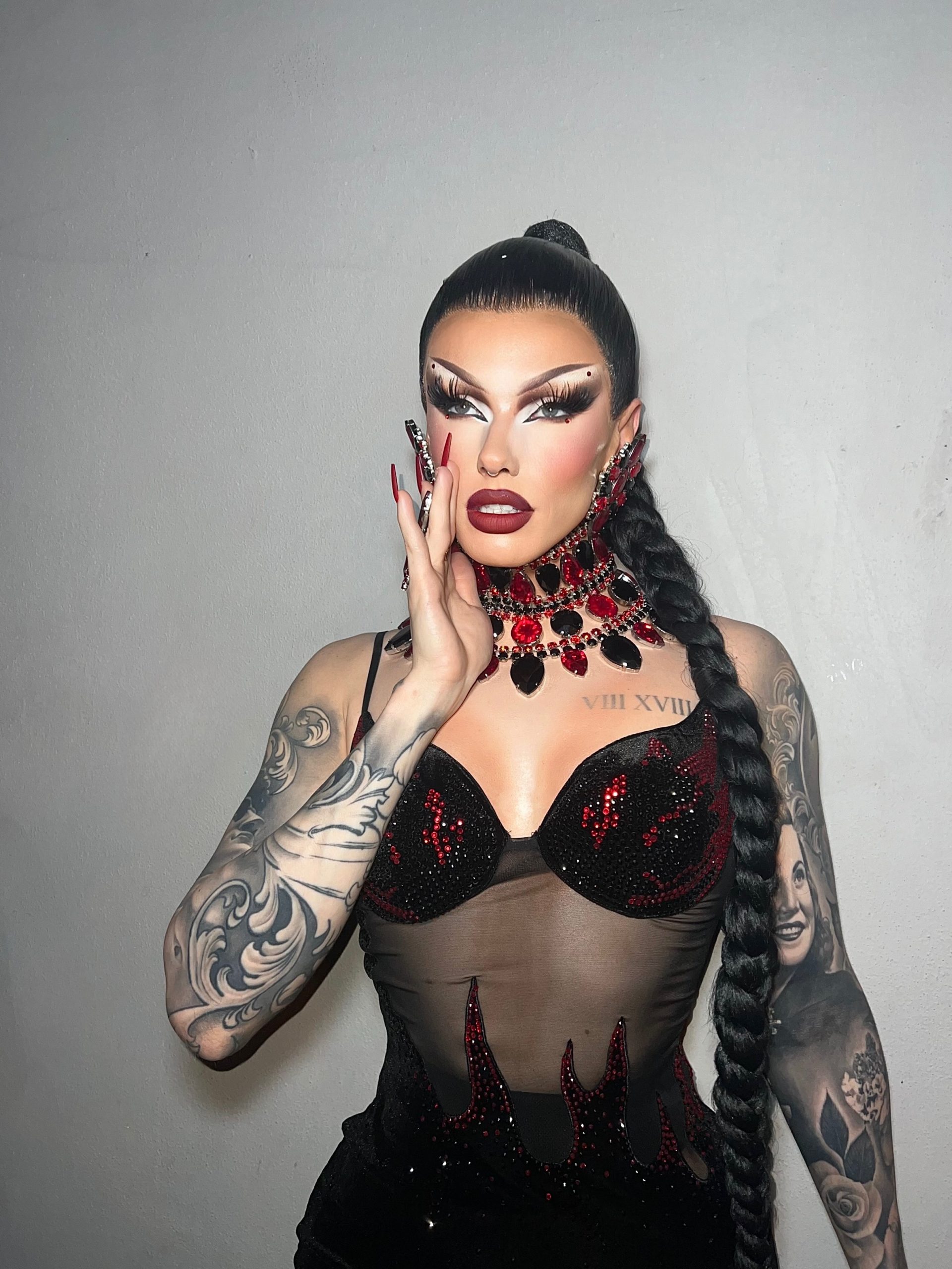 My name is Tyler, also known on stage as “Dominink”. I grew up in the mountains of North Carolina originally, and now reside in Orlando Florida. My upbringing was pretty rough, actually, with an abusive Father and an incarcerated Mother. From the time I was a little boy, I always remember turning to art as an outlet for my emotions because everything around me was way too complex to understand. I actually remember how I would draw faces of beautiful women every time I sat down to create art, which makes total sense now that as a tattoo artist I specialize in realistic portraits and also do drag full time!