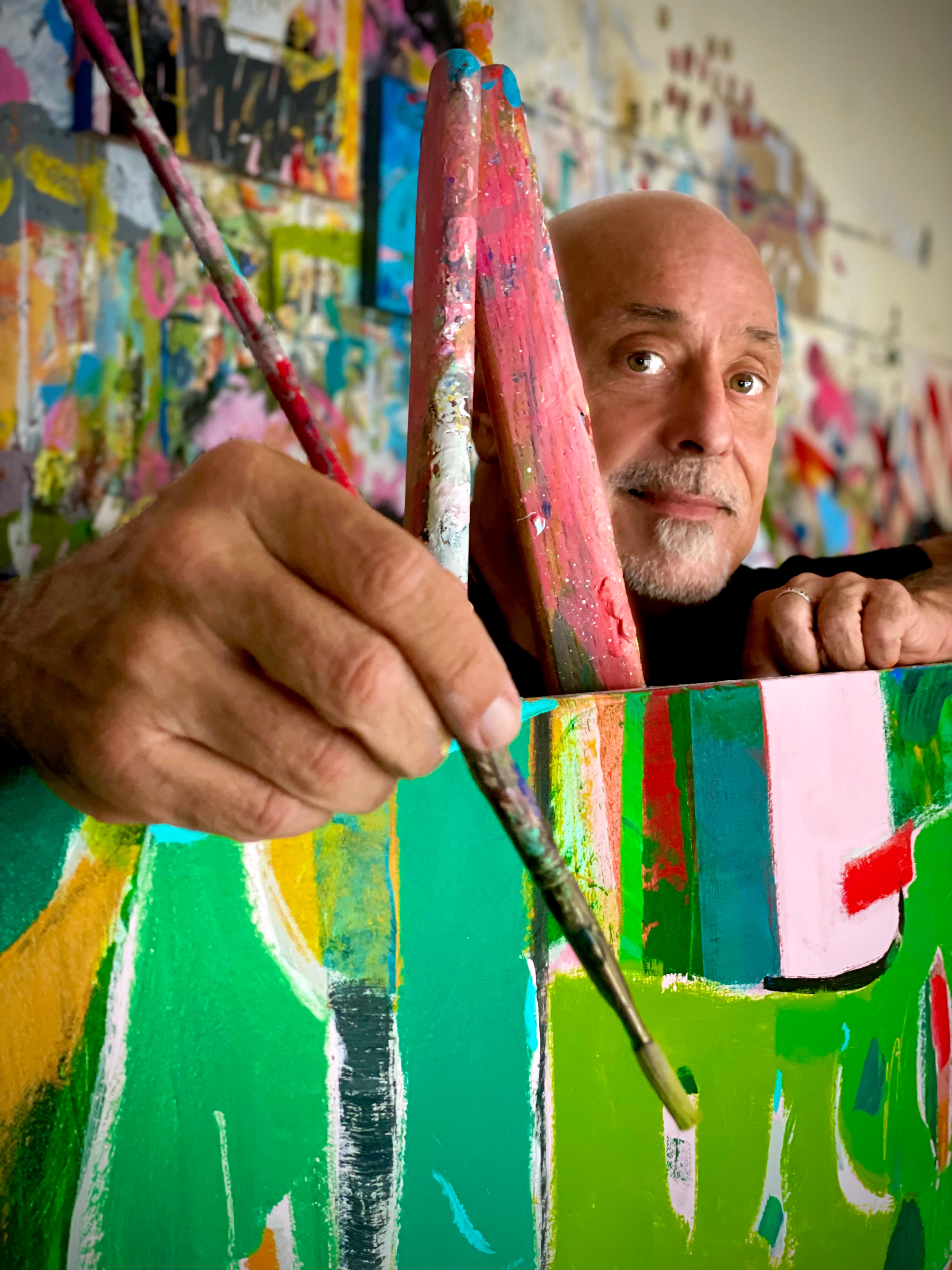 A graduate of the University of Florida, Victor is a graphic designer and full-time painter. Victor Bokas moved to Orlando in 1987 where he still lives and works from today. His unique artistic style is enriched by his journey through the creative field. Now, he gets to focus on his production process. His studio itself is an extension of his work, covered top to bottom in drips and splatters of paint giving a behind-the-scenes glimpse to his lively creative process. His work can be found in numerous corporate and museum collections as well as an 85 foot long mosaic floor featured in Orlando International Airport. His career path in Orlando includes 9 years as Senior Art Director for Sea World and 20 years as Senior Art Director Tupperware Brands.