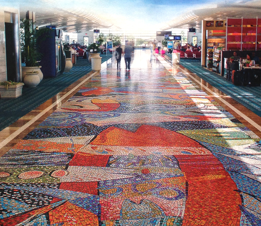 In 1999 my artwork was selected to be part of a 15-foot x 88-foot mosaic floor that welcomes visitors to Orlando International Airport. Located “A” terminal Southwest airlines.