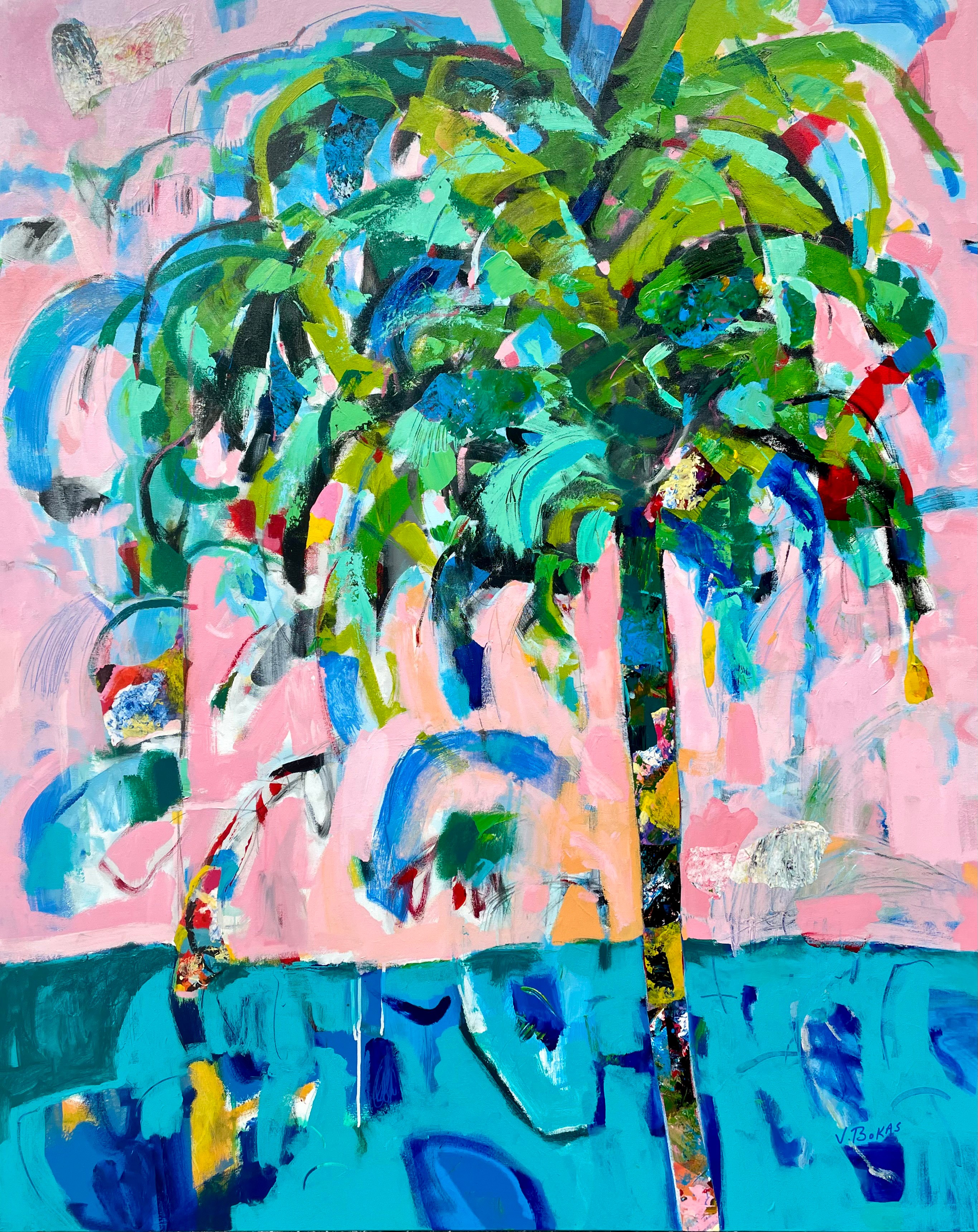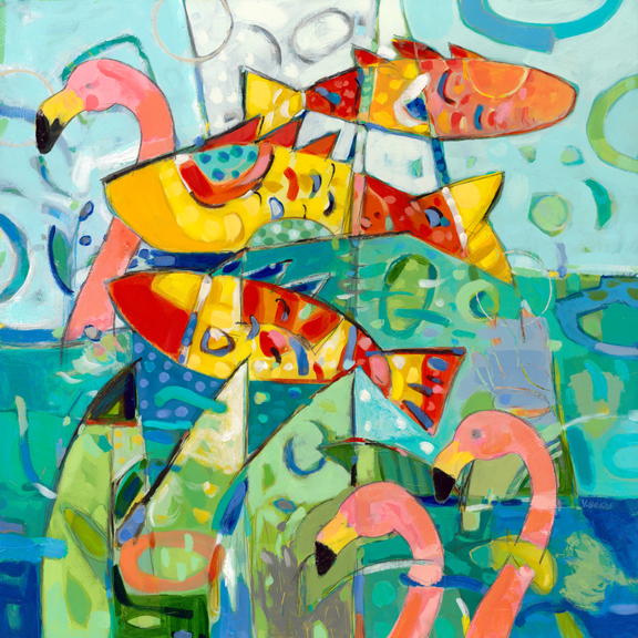 Victor Bokas grew up in the Florida Panhandle against a backdrop of palm trees, beautiful beaches and sunbathers. These influences are apparent in his paintings which boast vibrant colors, tropical icons and a good measure of whimsy. Victor also pays homage to his Greek heritage with statues, columns, olives and vases appearing in his work.