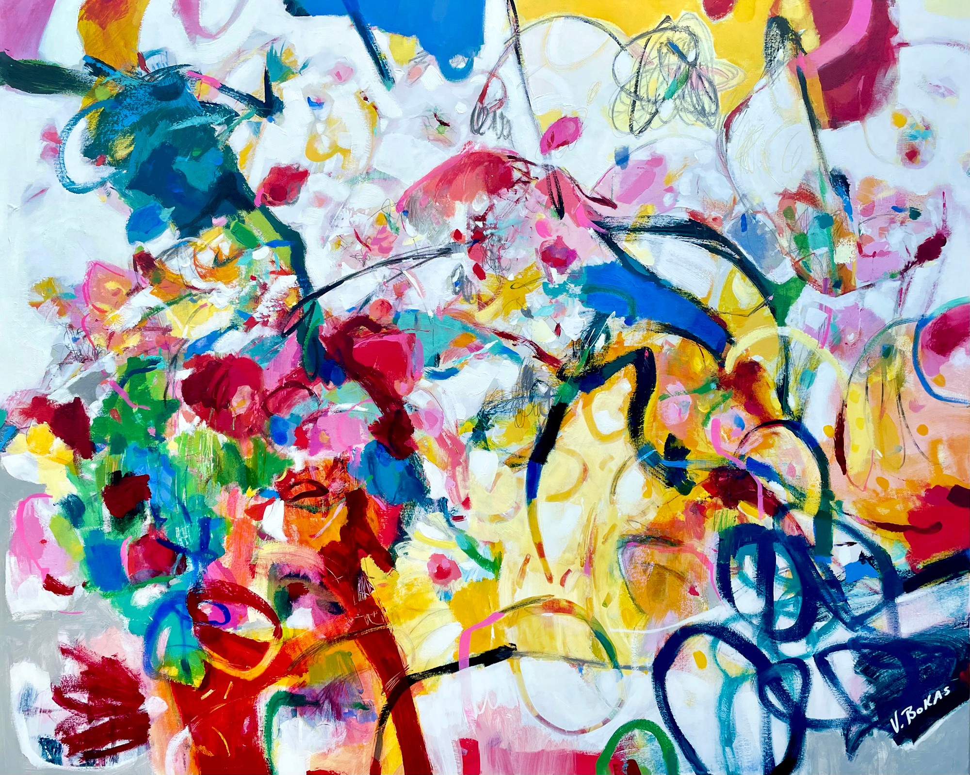 Victor Bokas creates artwork that is not only joyful and warm, but incredibly well executed. He has a deep understanding of composition and color which when combined, provide the most memorable viewing experience. He often incorporates wild, organic elements with grids and structure. This hybrid approach acts as a guide to assist the viewer in their journey across the canvas. It is this sort of mastery of skill that is so special when it comes around, Victor Bokas is truly a one of a kind artist.