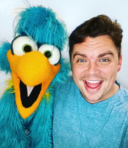 I’ve had the opportunity to perform with the Muppets over the years in live appearances and performances. This past year I worked on the BYU TV puppet series “9 Years to Neptune” as RJ Beverly the ship’s mechanic and many other characters. I’ve also done work on an online series called “Woof Chat News” and the new Amazon Kids series “Blippi’s Treehouse” with my fiancée Kelsey Brady. I’ve performed in other puppetry based shows such as “Jane Henson’s Nativity Story” for the holidays and an original musical by John Mason called “Carved” where I worked as a performer and Puppet Captain.