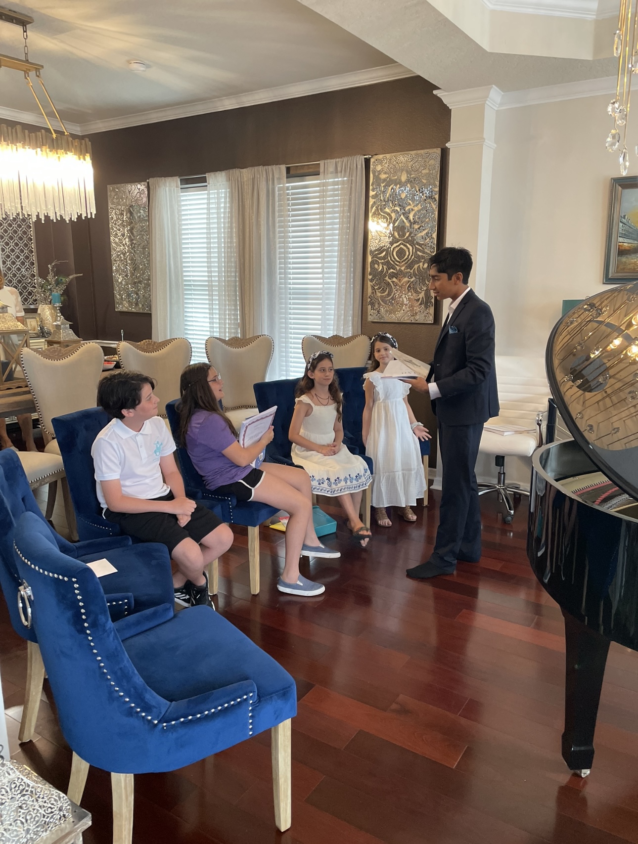 I turned to my piano, not as an escape, but as a way to give back. Piano has emotionally impacted and matured me in ways I cannot describe, and I wanted to mentor young kids by sharing my love for the instrument with them, with the goal to inspire young minds the same way I was inspired. I began teaching when I was 12. My first student was my neighbor. What started as one lesson evolved into something bigger, a sense of connection, of healing, of rediscovering worth through helping others find themselves within the music they played. Within a year, I had eight students, and what amazed me most wasn’t the growth, but the realization that I loved teaching and hosting as much as I loved playing. In May 2022, I hosted my first piano recital at my home. This defining moment was both nerve-wracking and unforgettable. Standing in front of an audience to speak, rather than perform, was something new for me, and it marked a turning point in my journey. The biggest lesson I learned in my first year is that the best outcomes are only possible through not only hard work, but also collaboration.