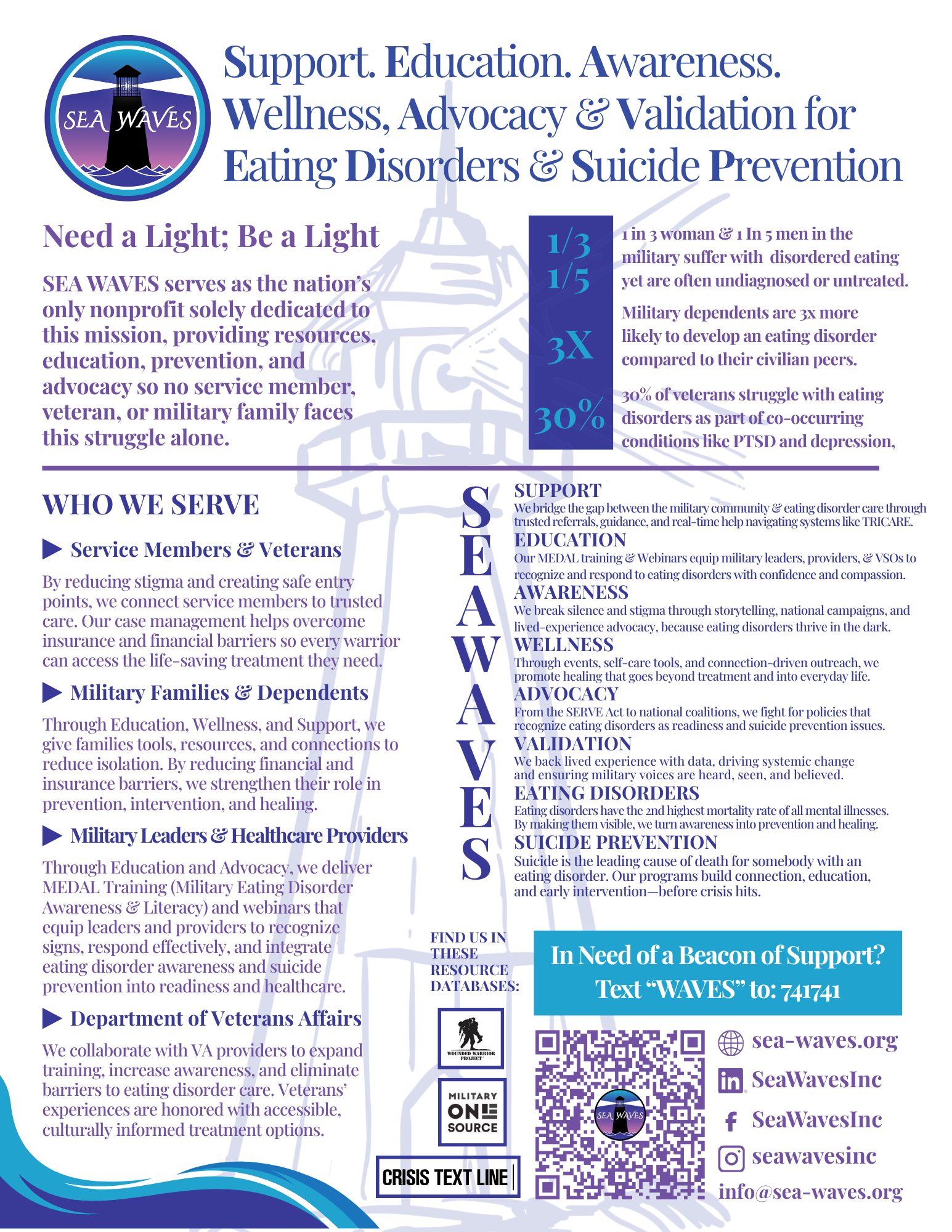 SEA WAVES is the nation’s first and only nonprofit organization dedicated exclusively to addressing eating disorders and related suicide risk within the military community. We serve active-duty service members, veterans, and military families through education, advocacy, prevention, and access to culturally informed resources.