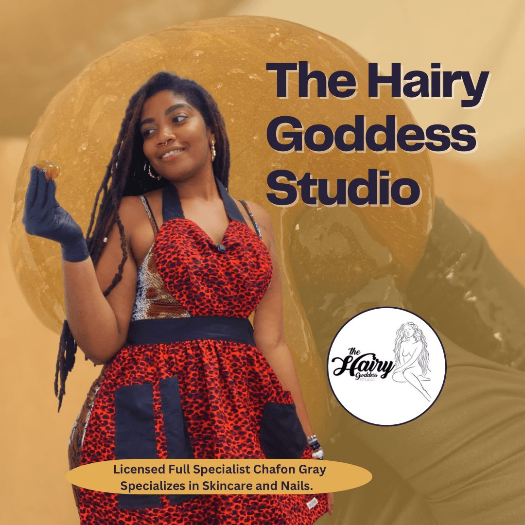 Hello my name is Chafon Gray and I am a Full Specialist (dual license of Esthetician and Nail Tech) and my business name is The Hairy Goddess Studio. I have always been a hairy person from the day I was born and have experienced being bullied for it so I am very passionate and resonate with my business. I specialize in hair removal services for any and everyone, I am a safe space, who is interested Body Sugaring or experiencing ingrown hairs. Body Sugaring is a alternative form of hair removal to waxing and shaving. Unlike waxing Sugaring is applied against the grain of your hair and removed (flicked off) in the opposite direction and is water soluble for easy clean up off any surface.