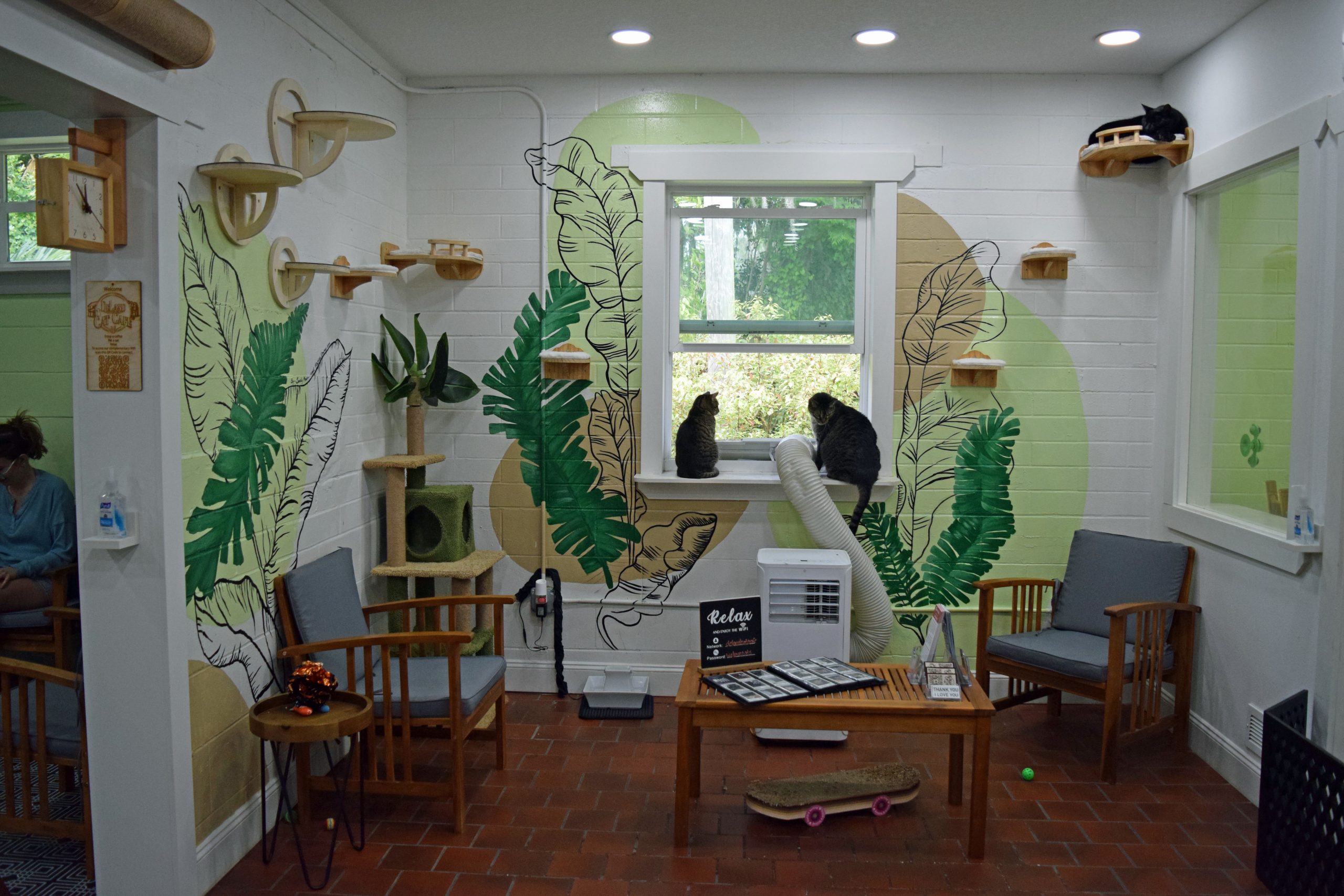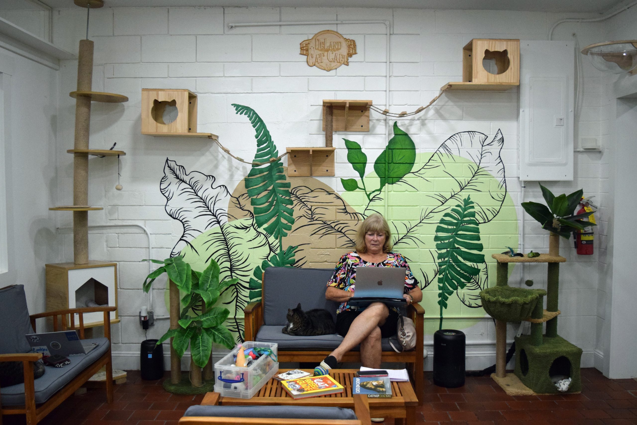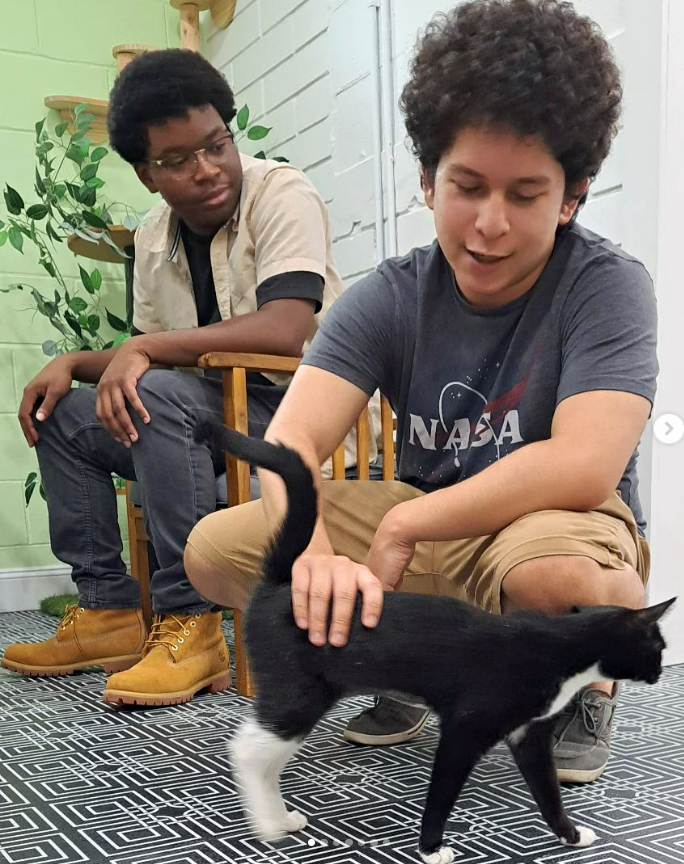 During the pandemic my 9 year old daughter & I traveled to Miami & visited the cat cafes there. We both loved it & she said that she wished there was one in our town of DeLand. She drew pictures of what her cat cafe would look like and that led to the actual planning of it. We approached a local entrepreneurial family that opened the local coffee shop in town called Trilogy Coffee to see if they would be interested in a partnership. Together we renovated an old restaurant & separated the building in half. One side is the cafe a.k.a. Trilogy Kitchen, the other side is the cat adoption lounge. The DeLand Cat Cafe was opened in June 2023 & since then we have had 337 adoptions! We work with a local animal shelter called New Hope as well as Halifax Humane Society. We also work with our local trappers. All of the cats are fixed, vaccinated, microchipped, tested for Feline AIDS & Feline Leukemia. We are a Fear Free Shelter, that means we do not have any cages or kennels of any kind. Our space is similar to a living room in a house where our cats can free roam. They learn to socialize with our other cats. By the time they are adopted, they are not scared, which means that they won’t be returned.