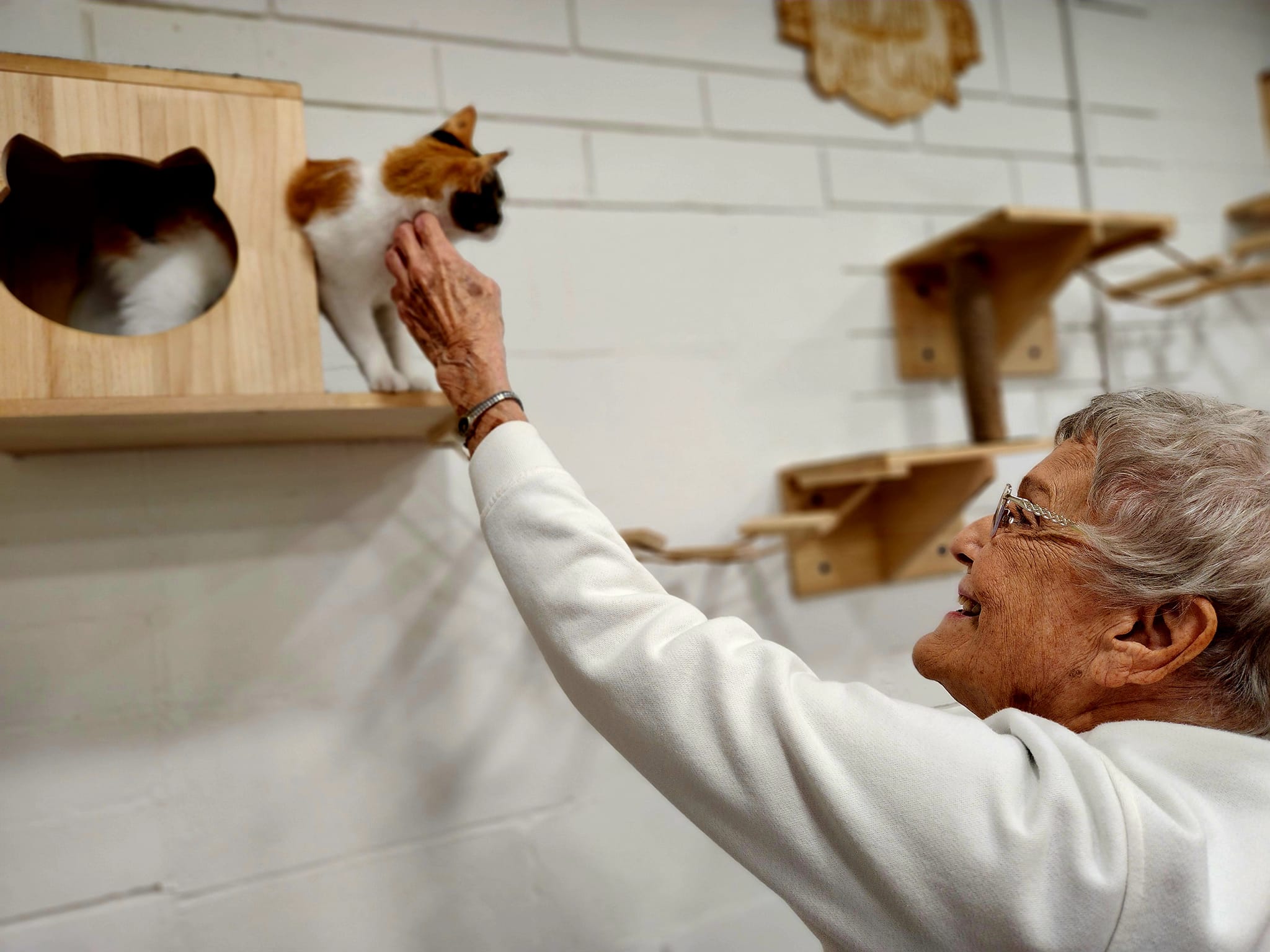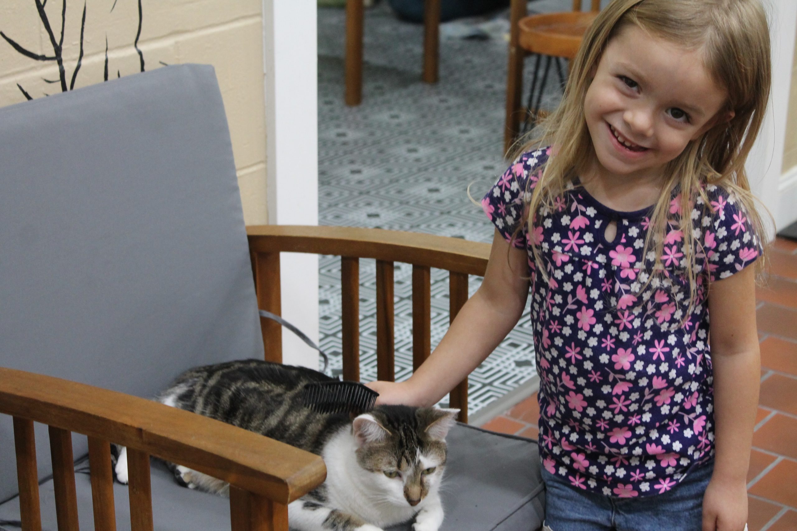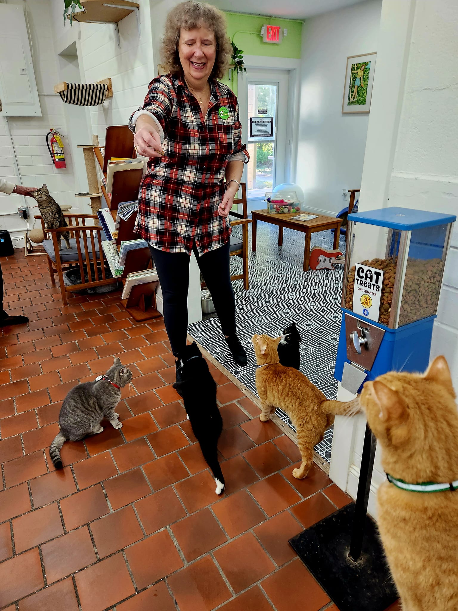 During the pandemic my 9 year old daughter & I traveled to Miami & visited the cat cafes there. We both loved it & she said that she wished there was one in our town of DeLand. She drew pictures of what her cat cafe would look like and that led to the actual planning of it. We approached a local entrepreneurial family that opened the local coffee shop in town called Trilogy Coffee to see if they would be interested in a partnership. Together we renovated an old restaurant & separated the building in half. One side is the cafe a.k.a. Trilogy Kitchen, the other side is the cat adoption lounge. The DeLand Cat Cafe was opened in June 2023 & since then we have had 337 adoptions! We work with a local animal shelter called New Hope as well as Halifax Humane Society. We also work with our local trappers. All of the cats are fixed, vaccinated, microchipped, tested for Feline AIDS & Feline Leukemia. We are a Fear Free Shelter, that means we do not have any cages or kennels of any kind. Our space is similar to a living room in a house where our cats can free roam. They learn to socialize with our other cats. By the time they are adopted, they are not scared, which means that they won’t be returned.