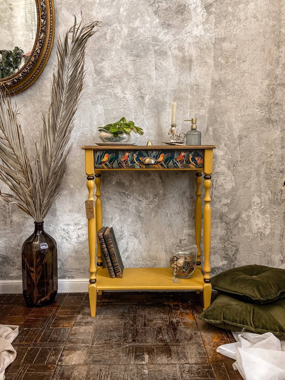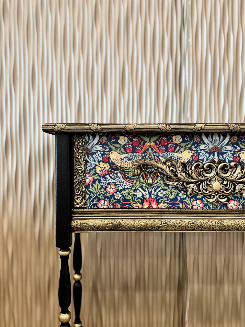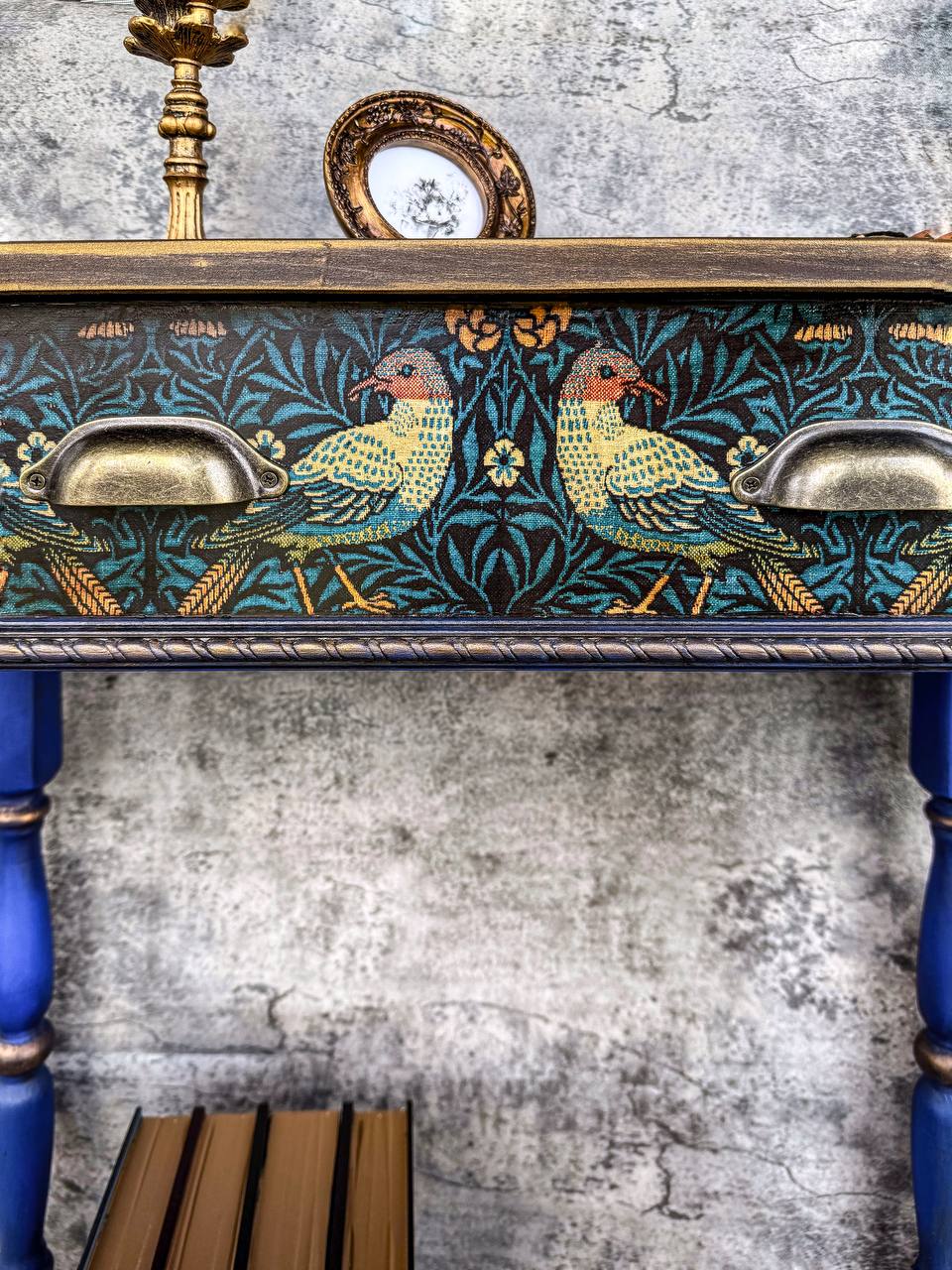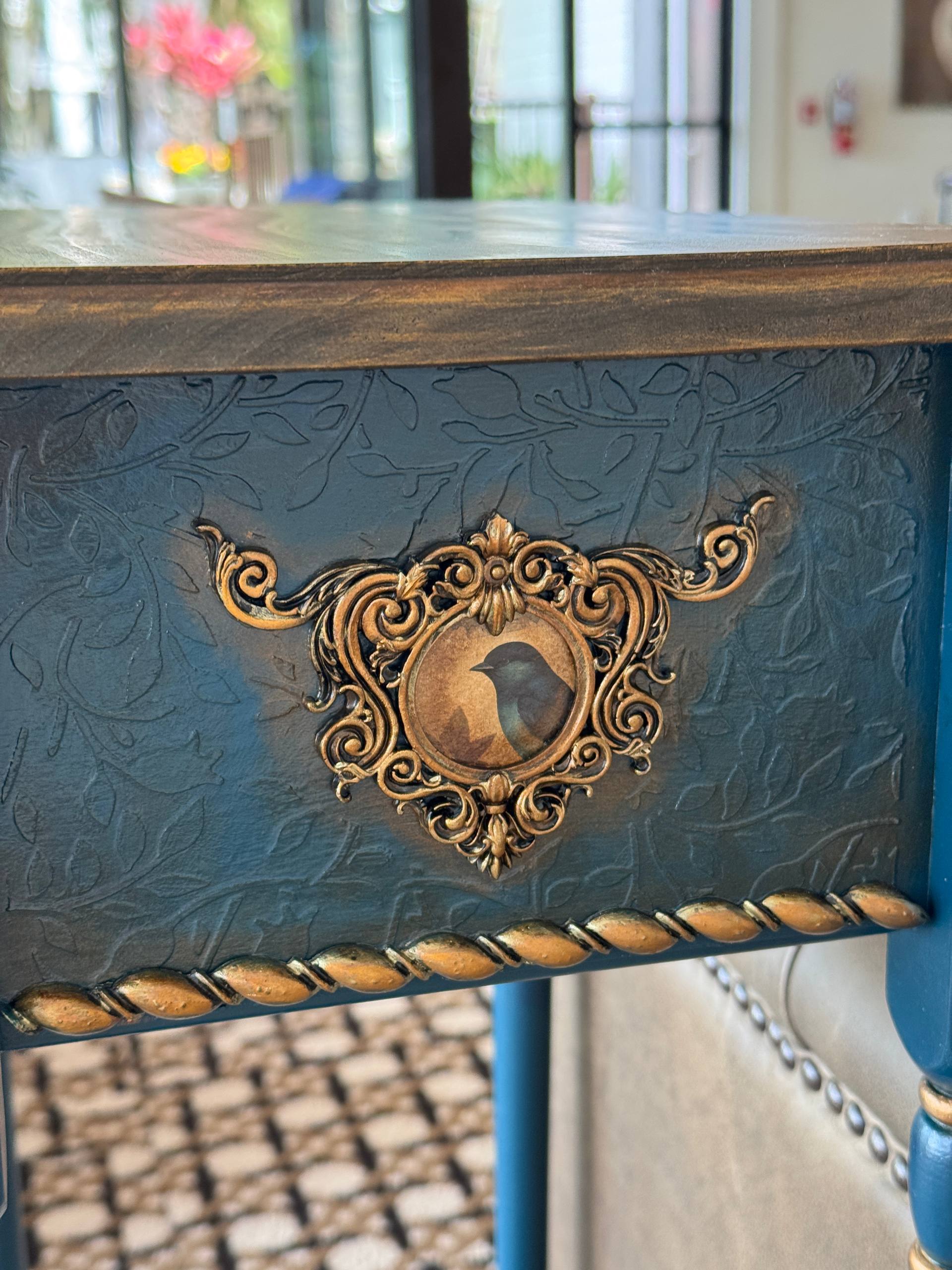 That environment shaped me more than I realized at the time. When I began restoring old furniture during lockdown, it felt like coming home. It wasn’t long before I moved from restoration to creation — building sculptural console tables with hand-carved legs, botanical motifs, aged patinas, gilded surfaces, and layers of texture that echo both nature and nostalgia.