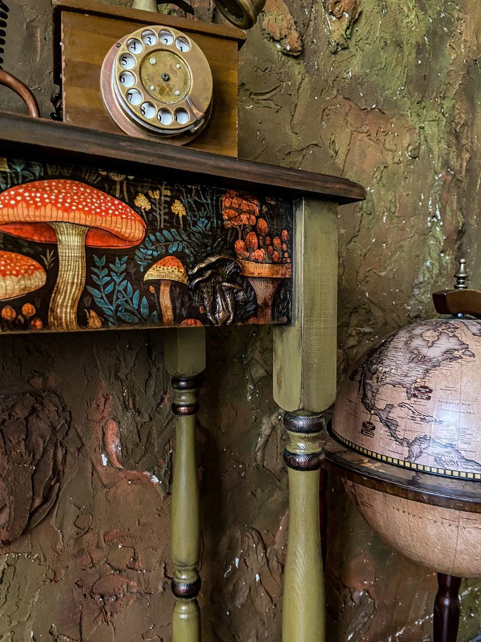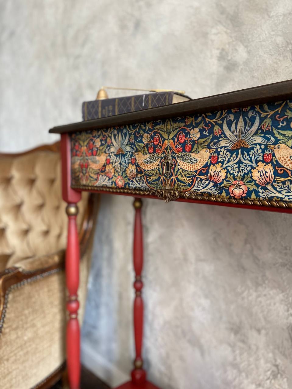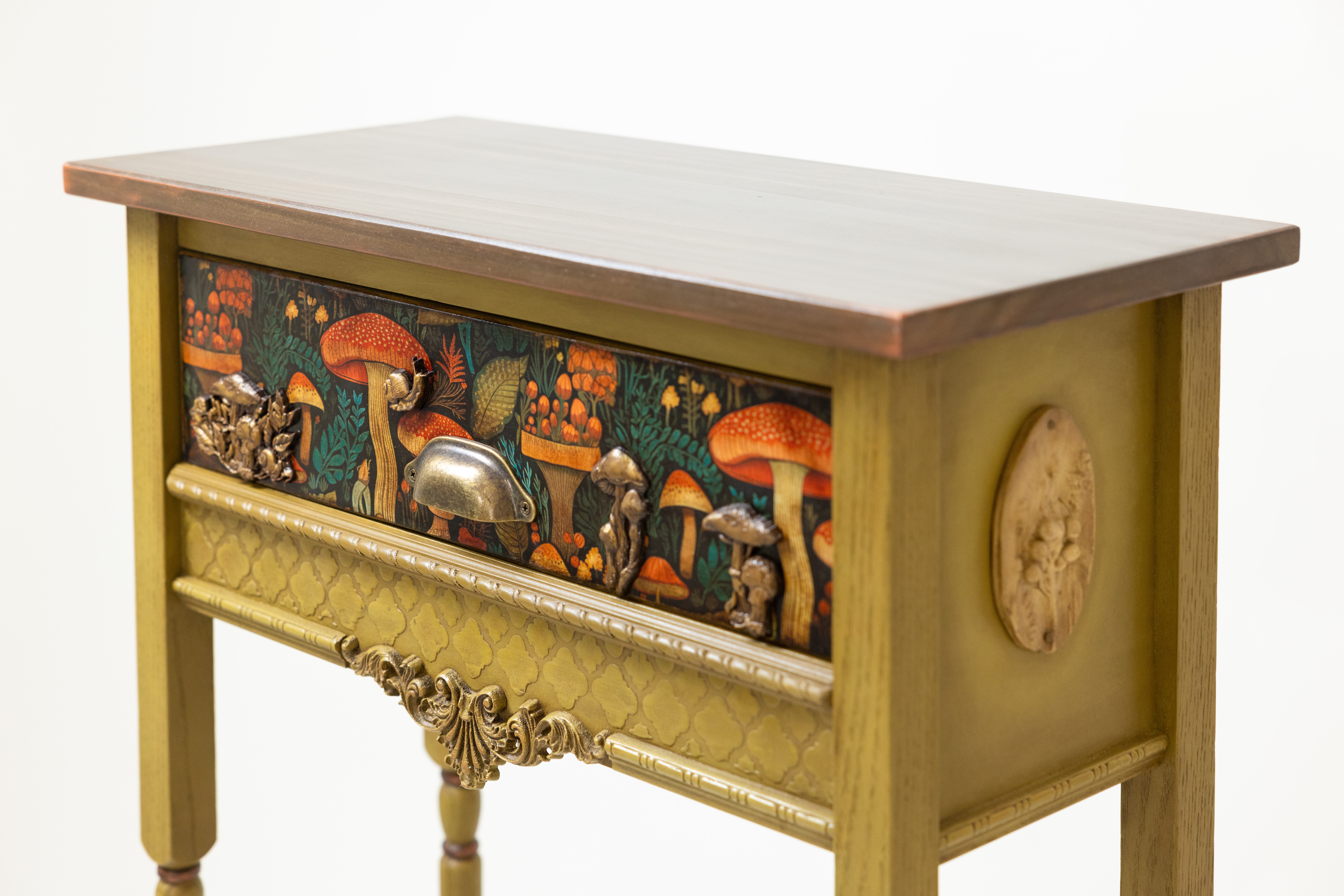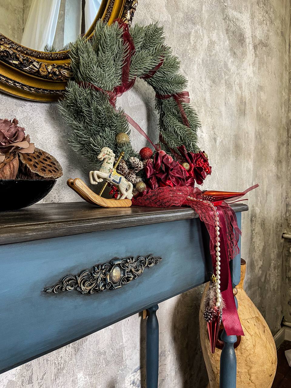 That environment shaped me more than I realized at the time. When I began restoring old furniture during lockdown, it felt like coming home. It wasn’t long before I moved from restoration to creation — building sculptural console tables with hand-carved legs, botanical motifs, aged patinas, gilded surfaces, and layers of texture that echo both nature and nostalgia.