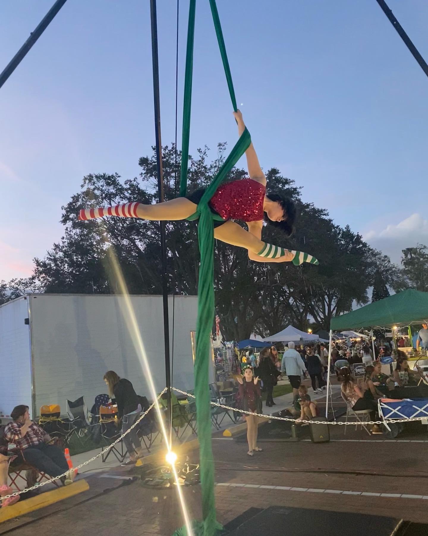 I started dancing at the age of 3, in a competitive dance studio for 13 years. After high school a friend invited me to an aerial yoga class. It was enjoyable but I wanted something a bit more challenging. I started taking aerial silks class and fell in love with it. I started taking classes 4-5 days a week and after about 2 years of training I became a coach for that studio. I then wanted to take aerial to a professional level and was hired with an entertainment company called Anti-Gravity. There I performed at multiple events such as corporate events, private parties, etc. providing entertainment in multiple apparatuses such as aerial silks, lyra, aerial hammock, and more. I also was hired through them for my first professional aerial silks job with them at Univeral Studios. I performed in the SuperStar Parade as an aerialist. This was a dream of mine to perform everyday as a “job”. My dream job, and one of the main reasons I started aerial, was to work on the Blue Horizons dolphin show at Seaworld on cloudswing. I worked very hard to achieve this goal, and I was hired as a part time performer. I was able to perform at Seaworld and Universal for about 6 months then found out I was pregnant with my first son. I had to stop performing at Seaworld, but I was able to continue performing at Universal until I was 20 weeks pregnant and our show had come to an end so it was a perfect ending from performing daily to becoming a mom. I still coached classes and performed at events. I had my 2nd son 2 years later, and decided I needed to concentrate more on my family. I would still coach classes but I no longer performed. I had move to the Apopka area, and wanted to get my aerial yoga certification. I started working at a yoga studio in downtown Mt Dora teaching arial yoga and kids silk classes. I ended up needing a bigger space because my kids silk classes were growing. I rented space out of a jujitsu gym for a year and a half building up clientele, and we had silk and lyra classes 4 days a week. I never thought I would one day have my own business running my own aerial studio. There is nothing like our classes in this area. We found a great opportunity to move into our own facility right down the road and in January 2020 Soar Athletics was established. I had myself and 3 other coaches at the time, running classes 5 days a week. We continue to grow each year, with multiple apparatuses such as silks, lyra, trapeze, hammock, toddler classes, speciality apparatus classes, fitness classes, adult only classes, as well we offer tumbling classes once a week. We also have our very own performance team of 12 girls that go out and perform at local events. we now have 6 coaches all female who are proud to be a full female business. We also have student showcases, recitals, twice a year where we sell tickets to family, friends, and the public to come and watch students perform what they have learned. Students really look the showcases. It has built so much confidence in our students. We love watching them come out of their shell and really be passionate for something they love doing. All while staying in shape. Our classes have helped many students overcome anxiety, become confident, and just grow as a person. As coaches it is one of our favorite things to watch them grow. We have had some students from the beginning and have been with us for 7 years now. We are a very family friendly studio and welcome anyone to come join us. I am now a single mom with 3 beautiful children, and I’m living the dream of having such an amazing studio family filled with nothing but love and support.