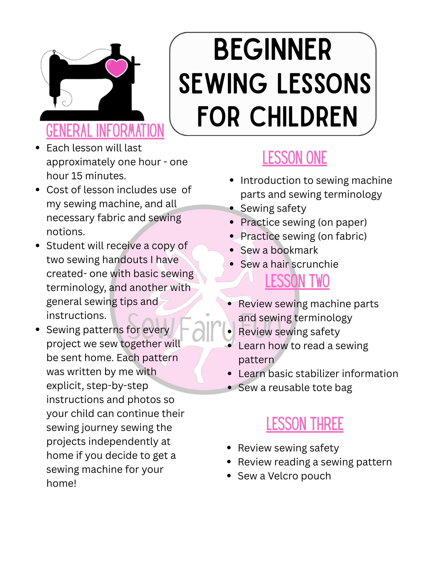 I am able to combine my prior experience of teaching children in the classroom, with my new passion of teaching sewing. I create lesson plans for my sewing lessons including full step-by-step picture tutorials of the projects we sew together during our lessons. This is so that students are able to go home with all of the tools they need to be able to sew the project again with fabric that they purchase, if they happen to have a sewing machine at home. Those who don’t, often find that a family member has a sewing machine they can use, and other families end up purchasing one for their home! It’s so much fun to watch each student’s sewing journey unfold.