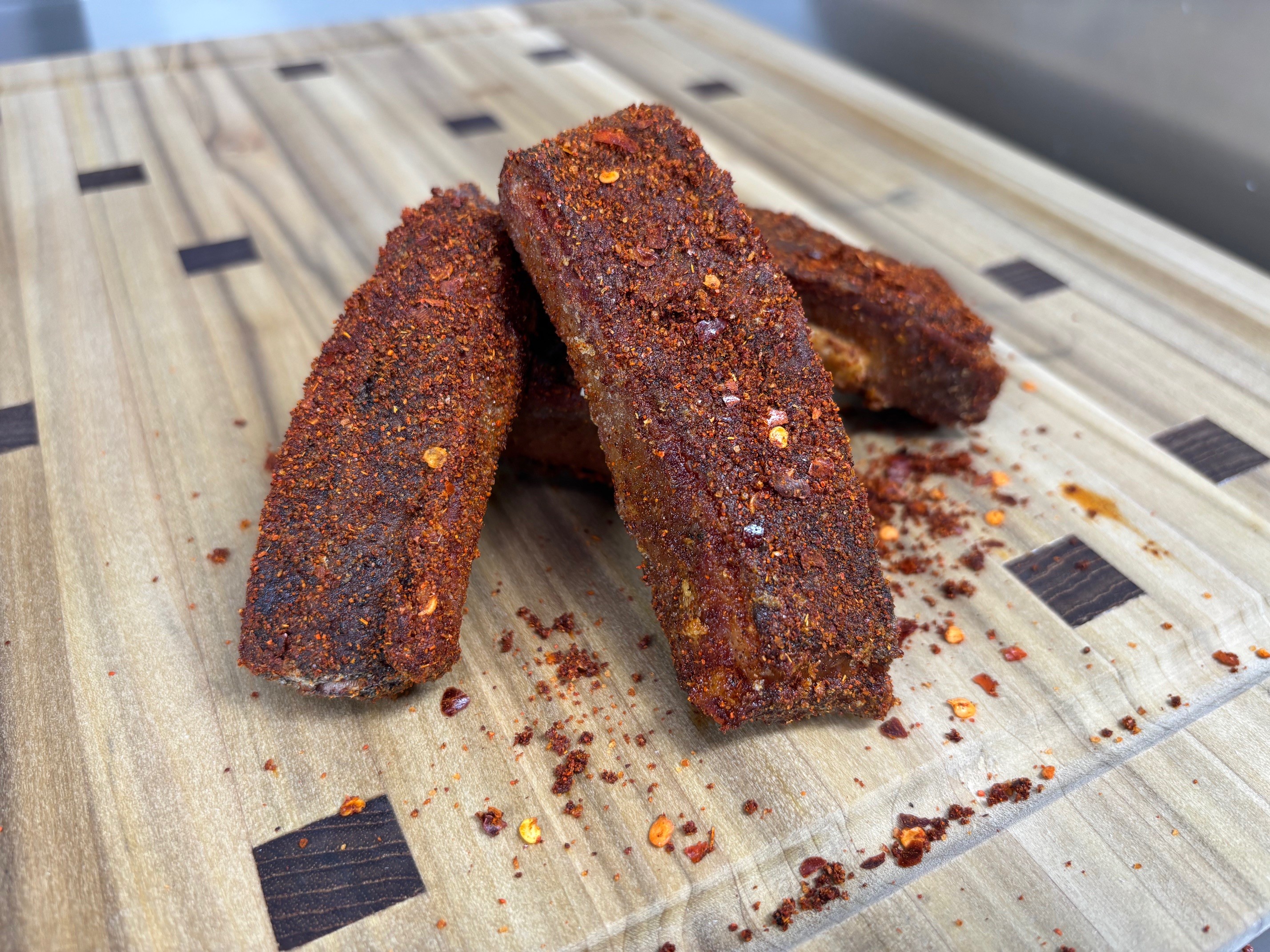 Beezer Eats specializes in eclectic food rooted in BBQ. I grew up in Texas and spent many years learning how to operate an offset smoker. Although BBQ is in my blood, I have been impacted and influenced by foods and flavors from all over the world. Our recent award for Best Appetizer at the Sanford Food Truck Battle was at the Sanford Food Truck Battle was won by our Crispy Spareribs.” Also: “tossed in a spicy Harissa dry rub.