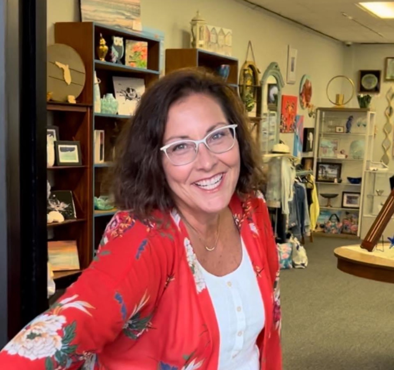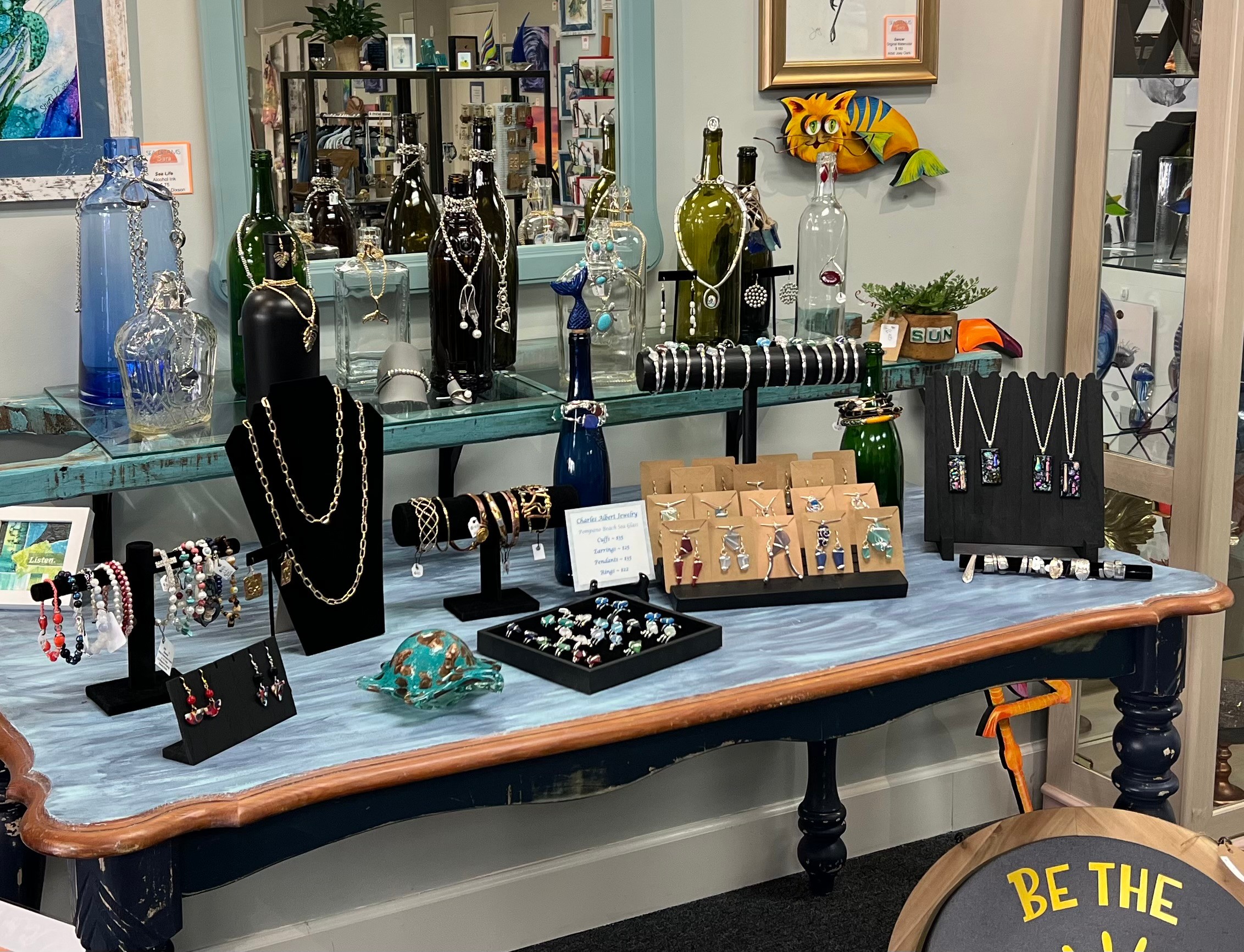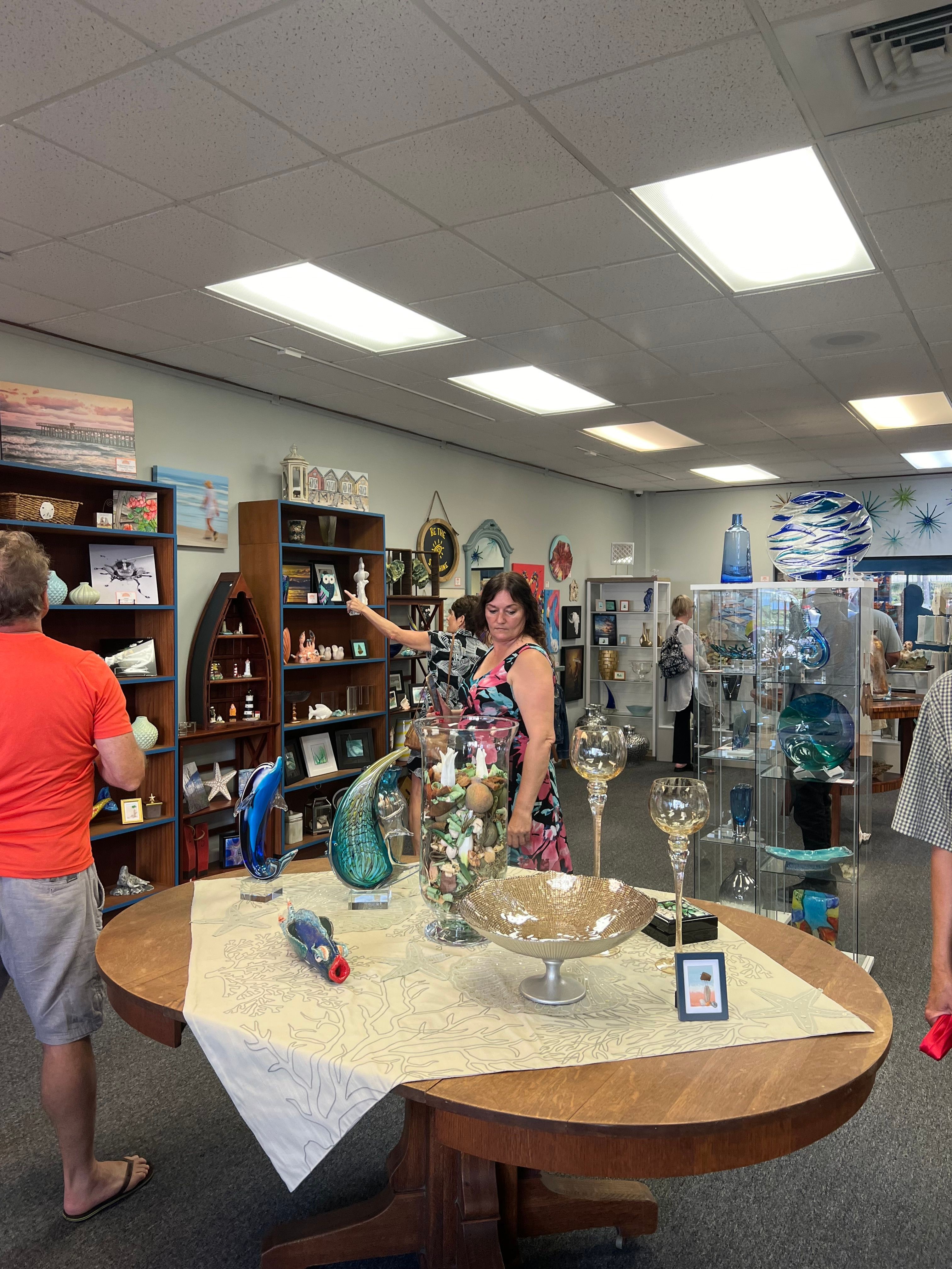 I grew up around music, art, and theater. I play the piano and sing. I graduated from the Conservatory of Music at the University of Missouri – Kansas City, with a degree in music therapy. I think the arts are incredibly important and that everyone is influenced by the arts – even if they don’t think they are, it’s just a matter of the TYPE of art. I’ve always been creative musically. I’ve painted murals for children bedrooms. I have season tickets to just about every venue available. The arts are in my veins. Currently I have a few items of my own work in the shop, but I honestly just haven’t had time since we opened – it’s a goal of mine this year to return to the creating side of things again as I can. I think I’m known for being an out of the box thinker. I love to find ways to solve problems a bit more ‘creatively’. I remember in my healthcare life, often during reviews I would be told that ‘while we love your ideas, we need you to hold on to the string that’s tethered to the box’. I’m proud that my kids friends still talk about the posters I would make at their birthday parties, and that friends contact me when they need a creative idea. Today, I stand in my shop and I’m beyond proud that I’ve accomplished creating a place that people now want to make a destination when they return to Florida, and that locals love to come in and escape for a bit. The shop isn’t pretentious, and I love it when customers come in and immediately admit they’ve never ‘been in someplace like this before’, and spend an hour walking around, asking questions, and getting so excited that they’ve found a piece that fits their budget that they can take home. That’s part of what sets us apart. We provide a level of customer service that doesn’t exist much anymore unfortunately. It’s still out there, but you have to find it. We greet you when you walk in, we offer you something to drink, we gage how much the customer wants to talk, we provide information on our artists – making it as educational as the customer wants. Our excitement breeds their excitement, and comfort level. I wrote a blog about uncomfortable kindness – we as a society don’t always know what to do when someone is kind to us. I’ve noticed with customers that sometimes they want no interaction – and that’s ok, but I do hope that they get back in their car, or back home, and think about their visit to the shop and say to themselves “that was nice”.